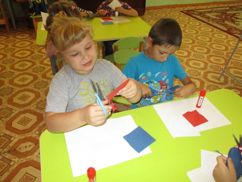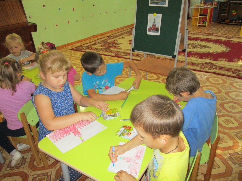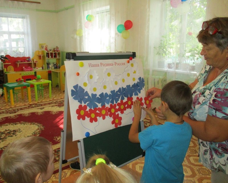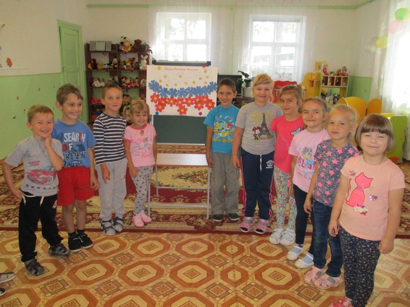 На занятиях по художественному творчеству, в технике рельефная лепка из пластилина на листах картона изобразили русскую красавицу берёзку, восковыми мелками нарисовали Спасскую башню Кремля, а в завершение проекта сделали коллективную работу, украсив, нарисованную на ватмане, территорию страны, цветами, вырезанными из белой, синей и красной бумаги – получился необыкновенно красивый российский триколор.